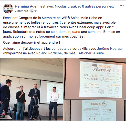 La force de cette formation, c’est d’avoir eu des ressources aussi bien pédagogiques sur la mémoire, le cerveau, la lecture rapide (au bout de 2 mois, j’ai pu me rendre compte des effets des séances hebdomadaires de lecture rapide, car j’ai pu mener mon travail, le suivi de cette formation, un MOOC tout en lisant de nombreux livres, ce que je n’arrivais plus à faire) qu’entreprenariales : en effet, nous avons pu développer nos softskills et nous mettre en situation de futurs entrepreneurs dans la démarche marketing, communication pour promouvoir nos conférences et ensuite nous lancer de nos propres ailes.