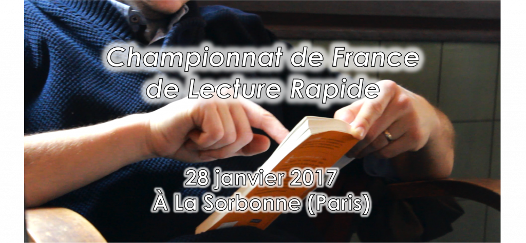 Le premier championnat de Lecture Rapide de France le 28 janvier 2017 de 8h30 à 10h30 au 17 rue de La Sorbonne, Université Paris 1 – La Sorbonne (Amphithéâtre Guizot).Plus d’informations sur : https://passiondapprendre.com/sl/championnat-lecture