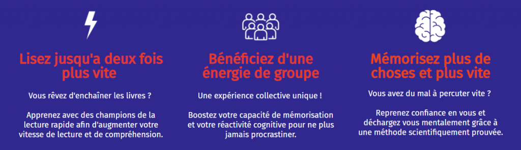 C’est pour cette raison nous avons prévu des sessions de coaching individuel pour vous aider à prendre mesure de progression. Vous allez par exemple recevoir votre programme individualisé de lecture rapide qui est adapté à votre situation de départ.