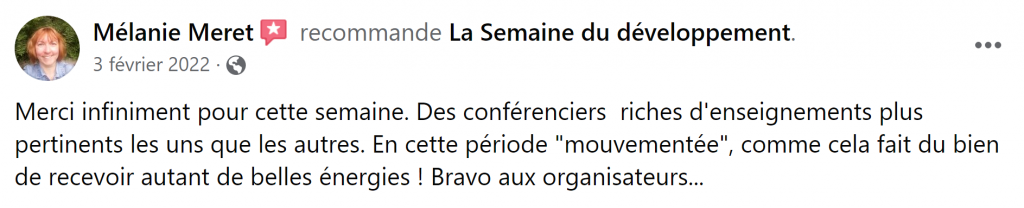 Patricia:"Bonjour Nicolas et Jérôme,Merci pour les liens me donnant accès à ces différentes conférences. Je les ai "survolées" (par manque de temps et parce que je connaissais déjà les outils qu'elles présentent). Bravo pour la diffusion de ces puissantes techniques d'apprentissages qui, à mon sens, devraient être enseignées dans les écoles dès le plus jeune âge ! Coeurdialement,"